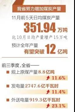 省能源局相關(guān)負(fù)責(zé)人表示,截至2021年10月底,我省已組織專家完成了39座核增產(chǎn)能煤礦的報(bào)告評(píng)審和現(xiàn)場(chǎng)核查,預(yù)計(jì)凈增產(chǎn)能4100萬(wàn)噸/年。按照下半年每月煤炭產(chǎn)量1億噸以上的目標(biāo),我省指導(dǎo)全省煤炭企業(yè)在確保安全的前提下,加強(qiáng)生產(chǎn)調(diào)度,充分釋放煤炭產(chǎn)能,努力增加煤炭產(chǎn)量。11月前5天日均煤炭產(chǎn)量為351.94萬(wàn)噸,比10月日均產(chǎn)量增產(chǎn)15萬(wàn)噸,預(yù)計(jì)全年產(chǎn)量有望突破12億噸。