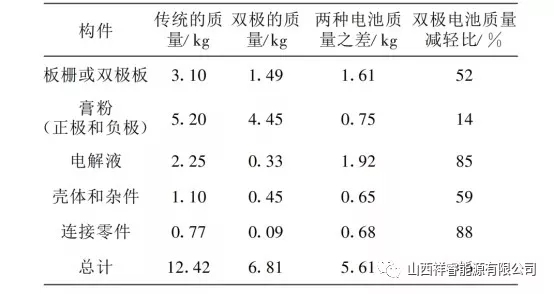 目前,除了動(dòng)力鋰電池外,我國動(dòng)力蓄電池的需求量增長(zhǎng)也很明朗。隨著電動(dòng)汽車的發(fā)展,與其配套的鉛酸蓄電池也得到了相應(yīng)的發(fā)展。蓄電池的使用壽命是制約著電動(dòng)汽車發(fā)展的重要因素之一,所以,提高鉛蓄電池的使用壽命至關(guān)重要。影響鉛酸蓄電池使用壽命的因素主要包括,與之相配套的充電器、自身質(zhì)量、用戶使用方式是否正確等。 提高蓄電池質(zhì)量,可以從鉛膏及固化入手,鉛膏添加劑是從事鉛酸電池研究的人員長(zhǎng)期研究的內(nèi)容之一,鉛膏主要作用是改善正極的導(dǎo)電性能,增加正極的孔率,改善負(fù)極充電接受能力和防止極板的硫鹽化。多數(shù)充電器在指示燈變燈指示充滿電以后,電池充入電量可能是97%~99%。雖然僅欠充電1%~3%的電量,對(duì)續(xù)行能力的影響幾乎可以忽略,但是也會(huì)形成欠充電積,所以電池充滿電變燈以后還是盡可能繼續(xù)進(jìn)行浮充電,這樣對(duì)抑制電池硫化也是有好處的。 目前,除了動(dòng)力鋰電池外,我國動(dòng)力蓄電池的需求量增長(zhǎng)也很明朗。電動(dòng)汽車所用的動(dòng)力鉛酸蓄電池種類多樣化,包括雙極性鉛酸蓄電池、水平鉛酸蓄電池,以及卷式電池等。雙極性密封鉛酸蓄電池最早是由美國Arias公司開發(fā)的,是一面有正極活性物質(zhì),另一面有負(fù)極活性物質(zhì)的堅(jiān)實(shí)薄片極板的電池,具有較高的比能量。 普通鉛酸電池的極板是豎立著放置的,而雙極性鉛酸蓄電池的電極是平臥著放置的。電極水平臥著放置是為了防止電解液層化,和活性物質(zhì)剝離,以及便于采用輕量薄形電極基片。通過采用雙極性結(jié)構(gòu),大大減輕了鉛酸電池的質(zhì)量,提高了設(shè)計(jì)效率。如表1,是對(duì)傳統(tǒng)的12V12Ah鉛酸電池與雙極性24V12Ah鉛酸電池零件分解質(zhì)量的比較。