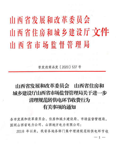 | 山西省進(jìn)一步清理規(guī)范轉(zhuǎn)供電環(huán)節(jié)收費(fèi)行為 |